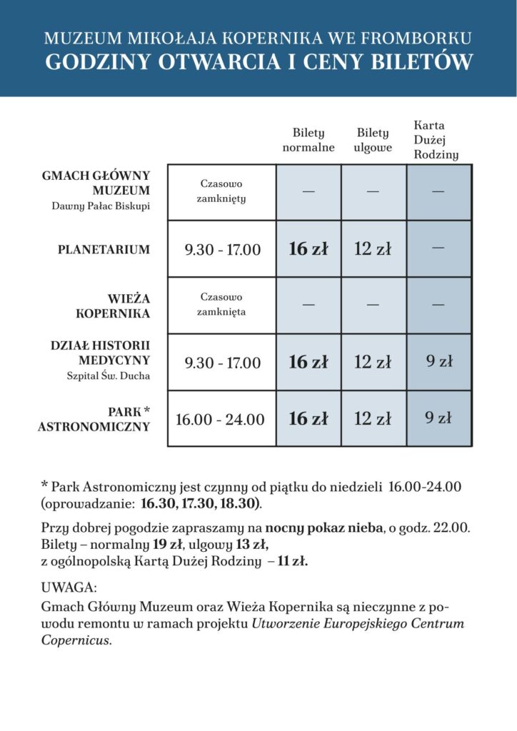 - W kasie głównej można nabyć bilety do wszystkich obiektów Muzeum Mikołaja Kopernika, w tym także do Planetarium.