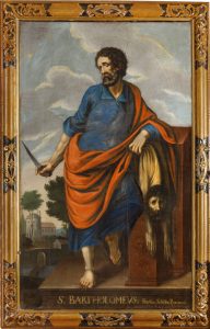| Bartłomiej | schorzenia skóry | -nóż trzymany w dłoni -skóra zdarta z ciała / przerzucona przez plecy / zawieszona na ręku |