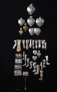 Większość obiektów pochodziła z wieku XIX, ale wiele reprezentowało również sztukę wcześniejszych stuleci. Do najstarszych prezentowanych eksponatów należą kwatery XVI-wiecznego ołtarza z kościoła p.w. św. Wawrzyńca w Mingajnach ukazujące sceny z życia św. Wawrzyńca i fotogramy kwater pasyjnych XVI-wiecznego poliptyku z katedry we Fromborku, na co dzień niedostępne dla widza, przedstawiające fenomenalny zapis chorób, które symbolicznie piętnują oprawców Chrystusa. Obiektem najmłodszym był relikwiarz bł. Reginy Protmann z kościoła św. Katarzyny w Braniewie, z 1999 r. autorstwa Andrzeja Adamskiego. Rozmachem malarskim i fantazją kompozycyjną odznaczają się głównie nowożytne dzieła malarskie z kościołów w Jezioranach (Święta Apolonia, XIX w.; Święty Roch orędownik dotkniętych epidemią, XIX w.), Henrykowie (Cud św. Antoniego, obraz Piotr Kolberga, ok. 1712 r.; Święty Walenty obdarzający łaską uzdrowienia, poł. XIX w.; Anioł Stróż, XVIII w.), Braniewie (Święty Roch z aniołem i psem oraz ofiary epidemii, obraz, XIX w. z kościoła p.w. Świętej Trójcy; Bisztynku (Święty Walenty i dzieci chore na epilepsję ofiarowane świętemu w celu uzdrowienia, obraz Jana Langhankiego, 1776 r. z kościoła p.w. św. Macieja; Święty Roch i ofiary dżumy, XIX w. z kościoła p.w. św. Michała), Rogiedlach (Święta Rozalia i ofiary zarazy, XVIII w.), Ornecie (Św. Rozalia, XVII w. z klasztoru Sióstr Katarzynek). Szczególny urok posiadały także ludowe wizerunki św. Rocha i św. Walentego, skrótowe w swoim przekazie, o wyrazistym choć nieco skrępowanym geście (obiekty pochodzące z kolekcji Muzeum Warmii i Mazur w Olsztynie). Wyrafinowanym przykładem rzeźby, przeznaczonej specjalnie do miejsca kultowego jest XVII-wieczna figura św. Rocha z kaplicy z Lubomina. Wystawa prezentowała też srebrne wota wyobrażające organy ciała z kościoła p.w. św. Macieja w Bisztynku związane z uleczającym kultem Najdroższej Krwi Chrystusa, na uwagę zasługiwał również fenomenalny obraz wotywny Św. Katarzyna, Matka Boska i św. Antoni Padewski z I poł. XVII w. z kościoła p.w. św. Mateusza w Różynce. Niepokój i mistyczny urok cechowały porażające turpizmem dzieła przedstawiające patronów od trądu Hioba (XVI- rzeźba ze zbiorów Muzeum Warmii i Mazur w Olsztynie) i Łazarza (XVII-wieczna rzeźba pierwotnie przeznaczona do szpitala św. Ducha w Kętrzynie, obecnie Muzeum Wojciecha Kętrzyńskiego w Kętrzynie).