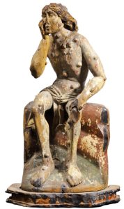 | Roch | zaraza, schorzenia skóry, trąd, skomplikowane porody wścieklizna, schorzenia stóp, grypa, choroby zwierząt, filokseria | -strój pielgrzyma -wrzód dżumowy na udzie -pies -anioł leczący ranę świętego |