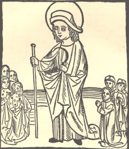 | Jodok | zaraza | -strój pustelnika/pielgrzyma -laska/kapelusz/znaki pielgrzymie -korona na ziemi -książka |