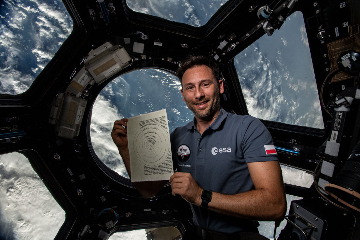 Równie duże emocje towarzyszyły nam, gdy w kosmosie przebywała kopia strony z rękopisu De revolutionibus. Była ona jednym z polskich symboli zabranych na Międzynarodową Stację Kosmiczną przez dr. Sławosza Uznańskiego-Wiśniewskiego. Diagram znalazł się na ISS wraz z polską flagą, rękopisem Mazurka As-dur Fryderyka Chopina, pamiątkami związanymi z Marią Skłodowską-Curie, krajką (fragmentem tkaniny ludowej w formie bransoletki), wierszami Wisławy Szymborskiej, polskimi literami, bryłką bursztynu, bryłką soli z Wieliczki, patchem (naszywką) z misji gen. Mirosława Hermaszewskiego oraz patchem i plakatem misji IGNIS.