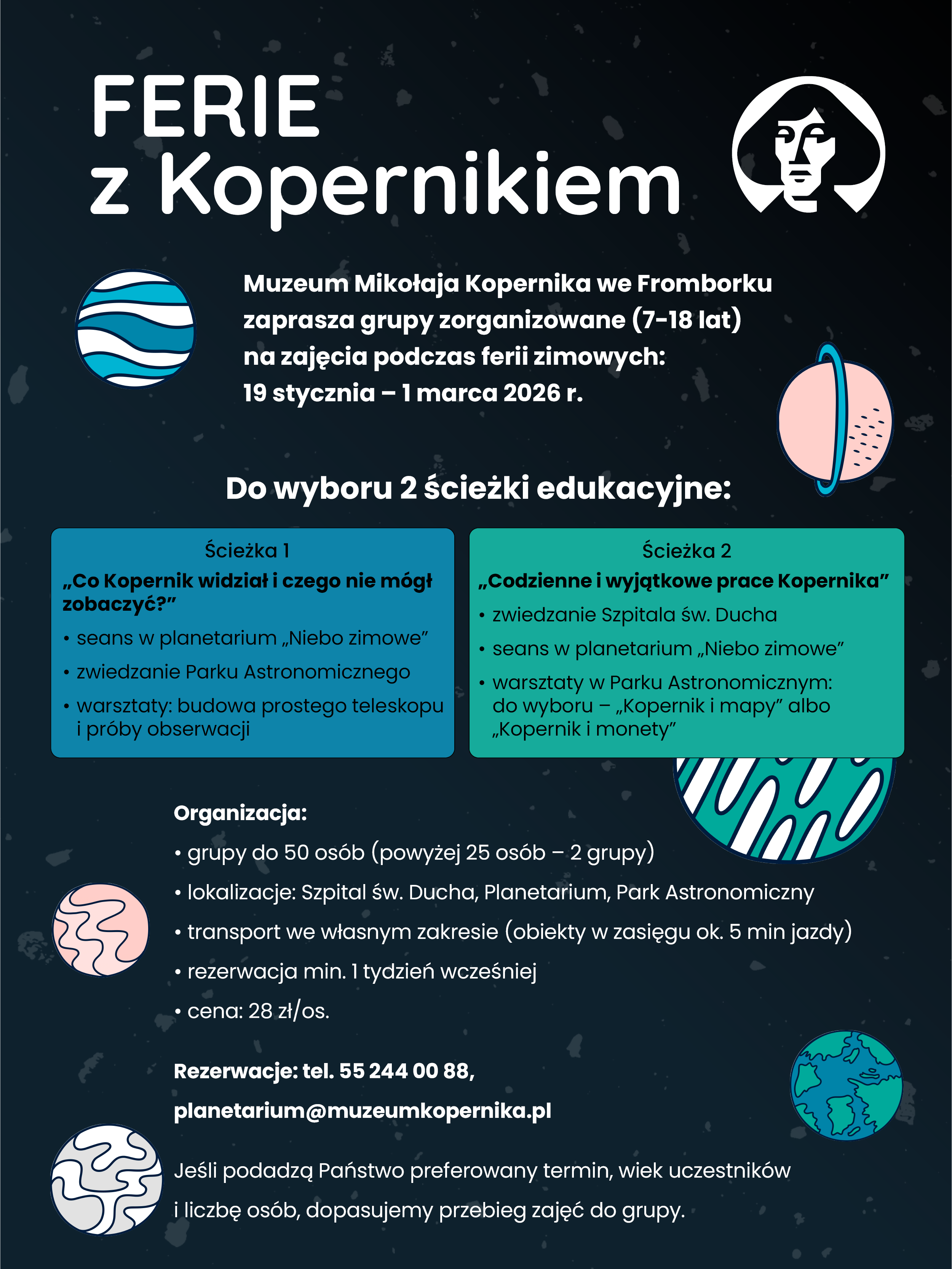 Muzeum Mikołaja Kopernika we Fromborku zaprasza do skorzystania ze specjalnej oferty edukacyjnej w okresie feryjnym – dla grup zorganizowanych dzieci i młodzieży. To świetna propozycja dla wszystkich organizatorów zajęć w okresie ferii zimowych.