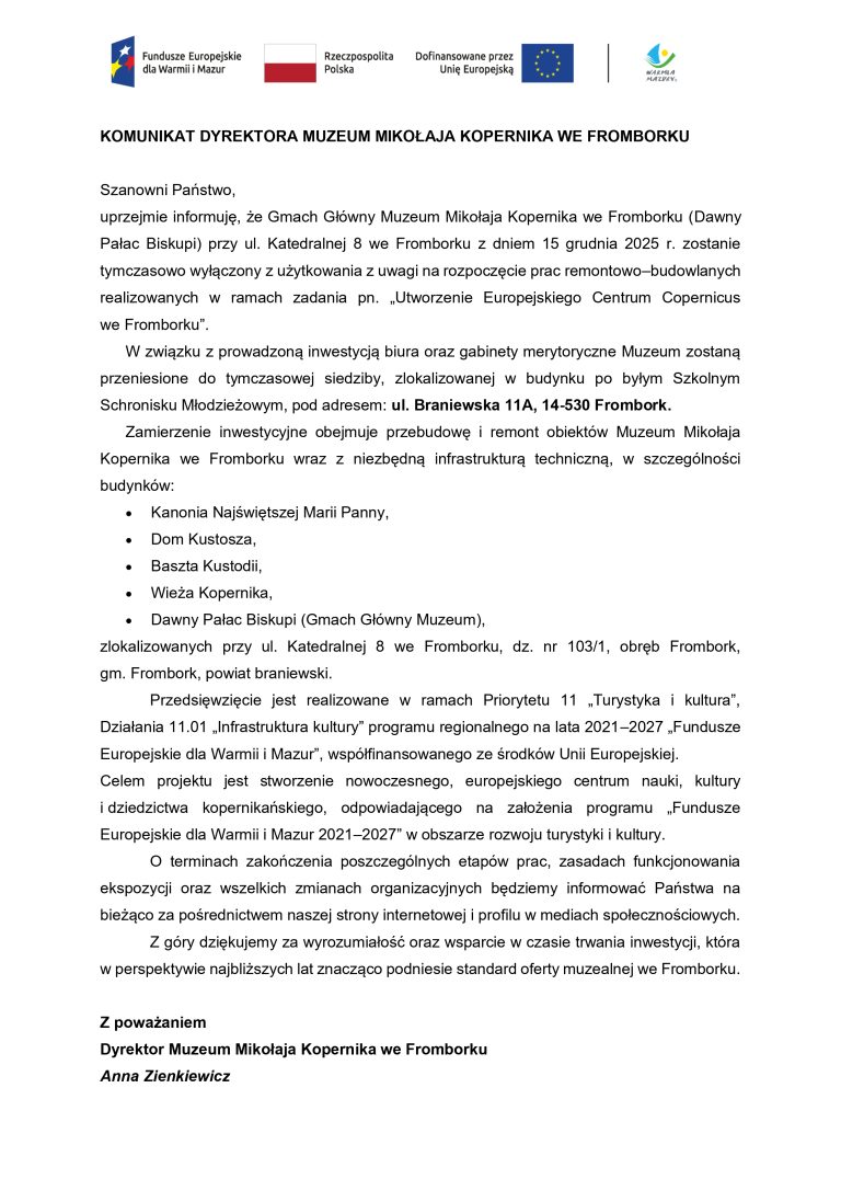 uprzejmie informuję, że Gmach Główny Muzeum Mikołaja Kopernika we Fromborku (dawny Pałac Biskupi) przy ul. Katedralnej 8 we Fromborku z dniem 15 grudnia 2025 r. zostanie tymczasowo wyłączony z użytkowania z uwagi na rozpoczęcie prac remontowo–budowlanych realizowanych w ramach zadania pn. „Utworzenie Europejskiego Centrum Copernicus we Fromborku”.